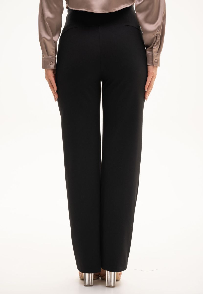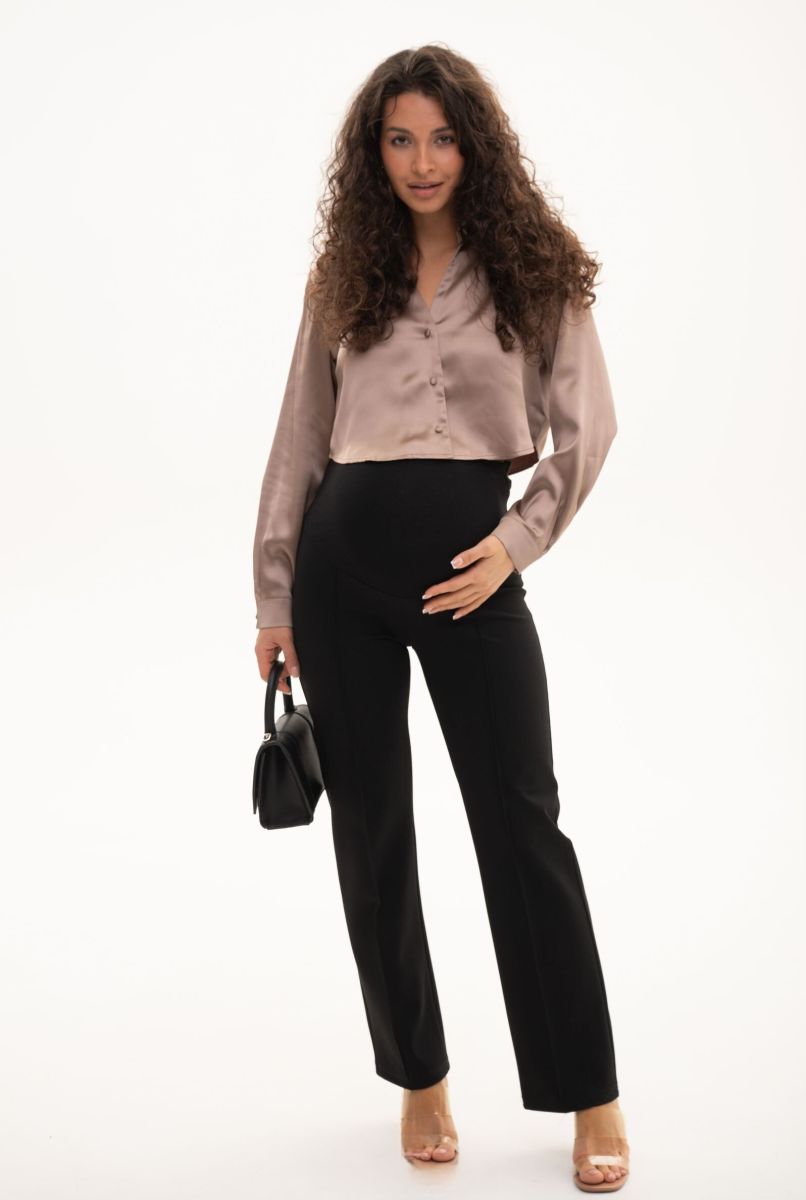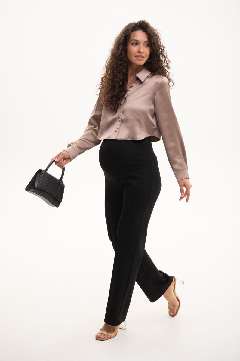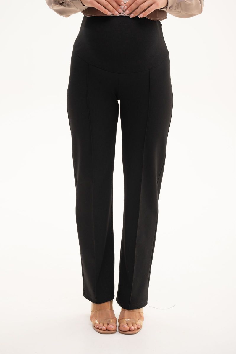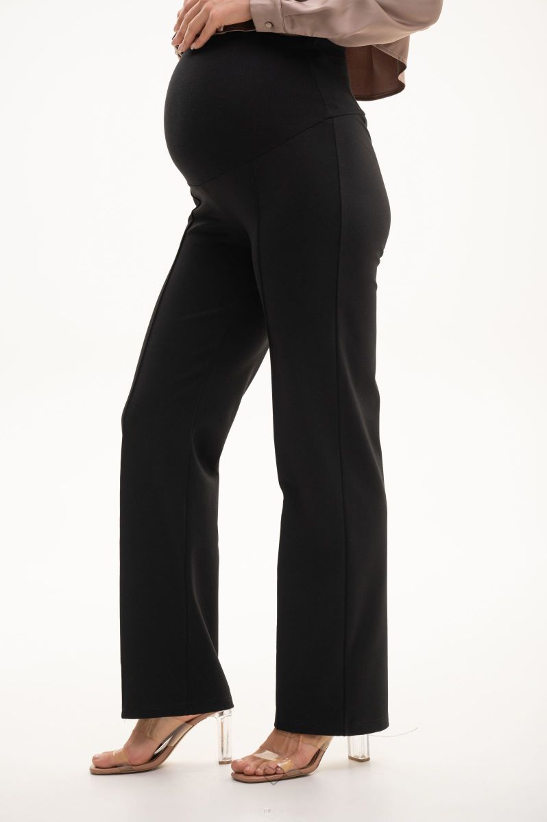 Повседневные брюки для беременных прямого кроя с отстроченными вертикальными стрелками. Высокий круговой трикотажный бандаж регулируется пуговкой по верху. Выполнены из тянущегося брючного трикотажа средней плотности премиум-джерси.