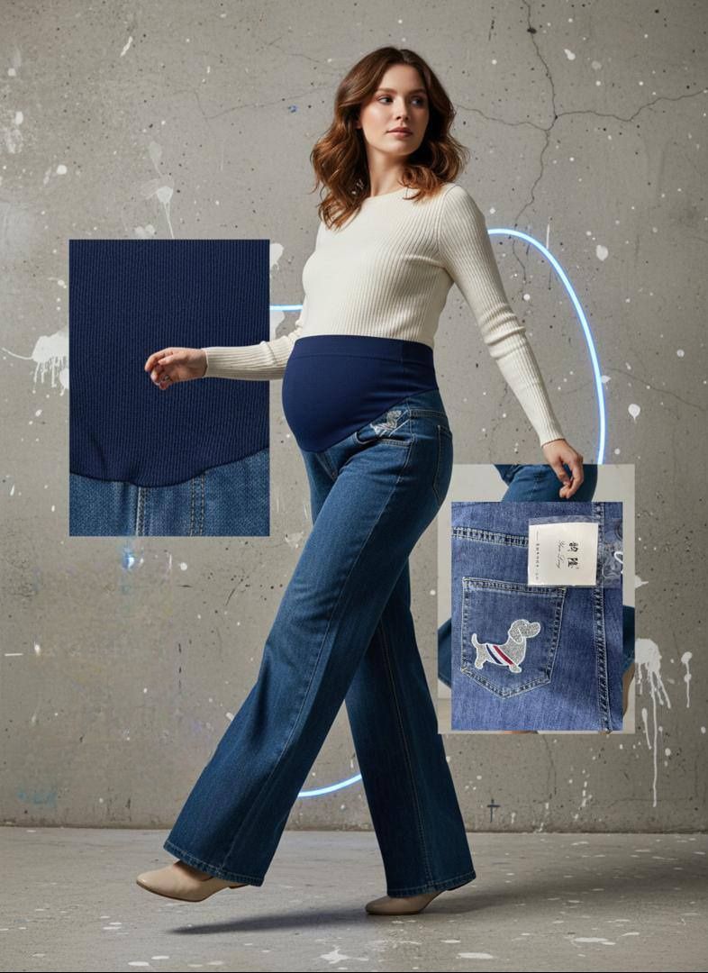 Джинсы для беременных свободного кроя с прямыми широкими штанинами. На кармашке - милая вышивка "собачка".