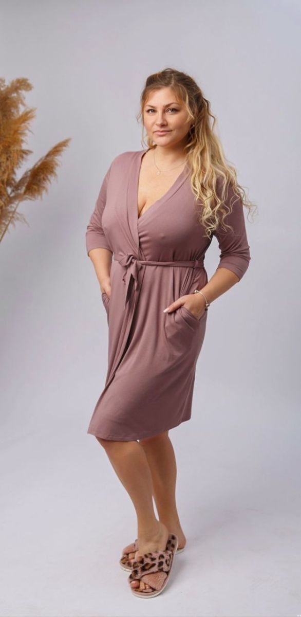 Халат из струящейся вискозы с большим запасом для растущего животика, удобные врезные карманы.