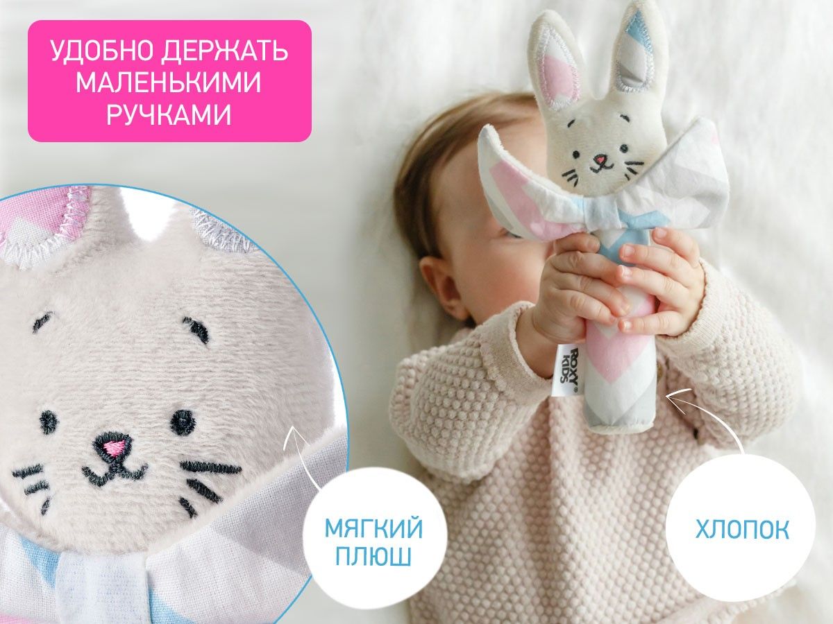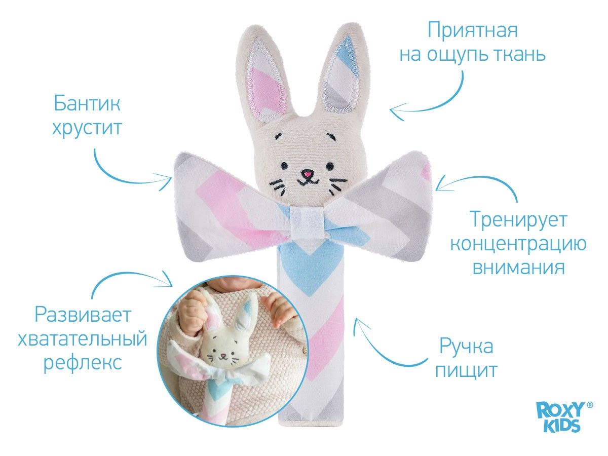 Развивающая игрушка-пищалка CRISPY BUNNY привлекает внимание малыша с помощью различных звуков, тренирует концентрацию, координацию движений, хватательный рефлекс и моторику рук! Бантик выполнен из приятного на ощупь хрустящего материала, а ручка игрушки издает веселый звук при нажатии. Благодаря небольшому размеру игрушку-пищалку удобно держать в маленьких ручках. Яркий образ игрушки поможет развить сенсорное восприятие цвета, формы и фактуры. Игрушка подходит для малышей с первых месяцев жизни.