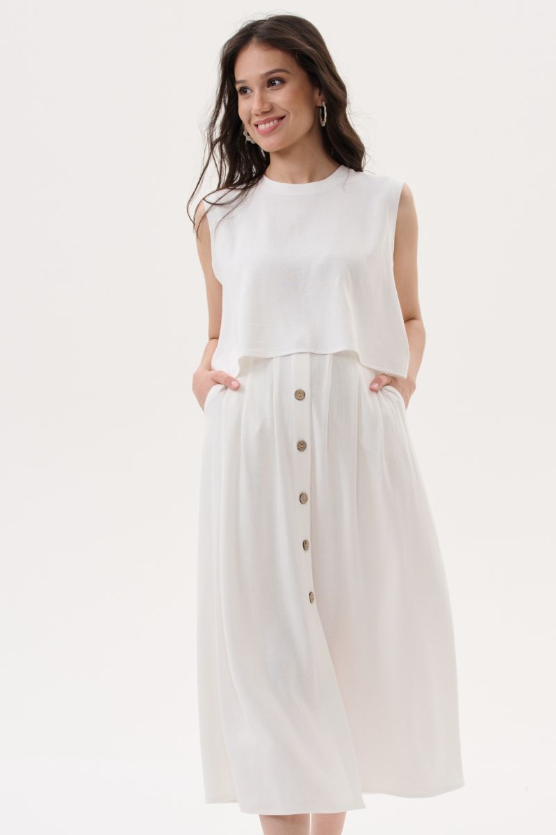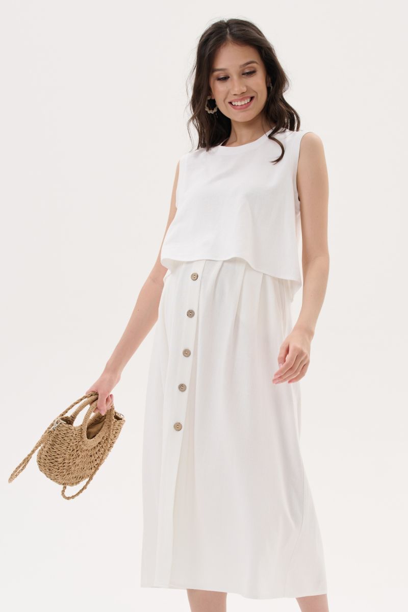Юбка миди с широким поясом, посаженным на резинку по спинке. Складочки добавят дополнительный объем для растущего животика, что позволит носить наряд на всем сроке и после родов. Деревянные пуговицы на юбке выполняют и декоративную, и функциональную роль,разбавят минималистичный дизайн и добавят образу изюминку.