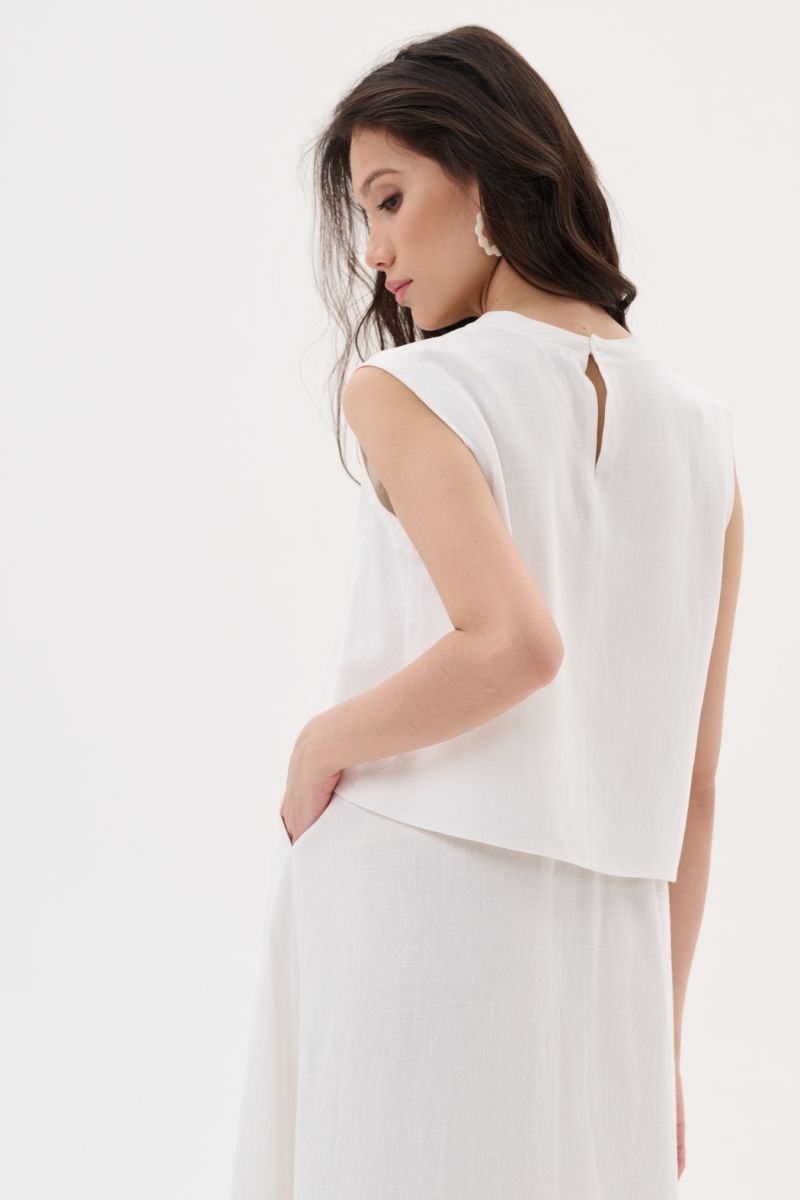 Топ свободного силуэта с ассиметричным низом и удлинением по спинке. Аккуратная круглая горловина и проймы обработаны обтачкой, а на спинке застежка для удобства.
