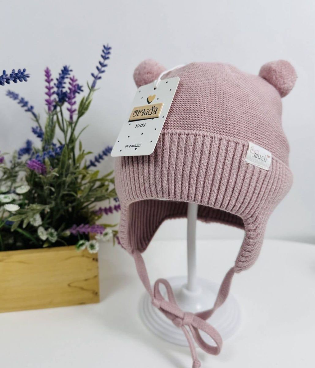 Шапочка с завязками и милыми помпонами-ушками для малыша от 6 до 18 месяцев.