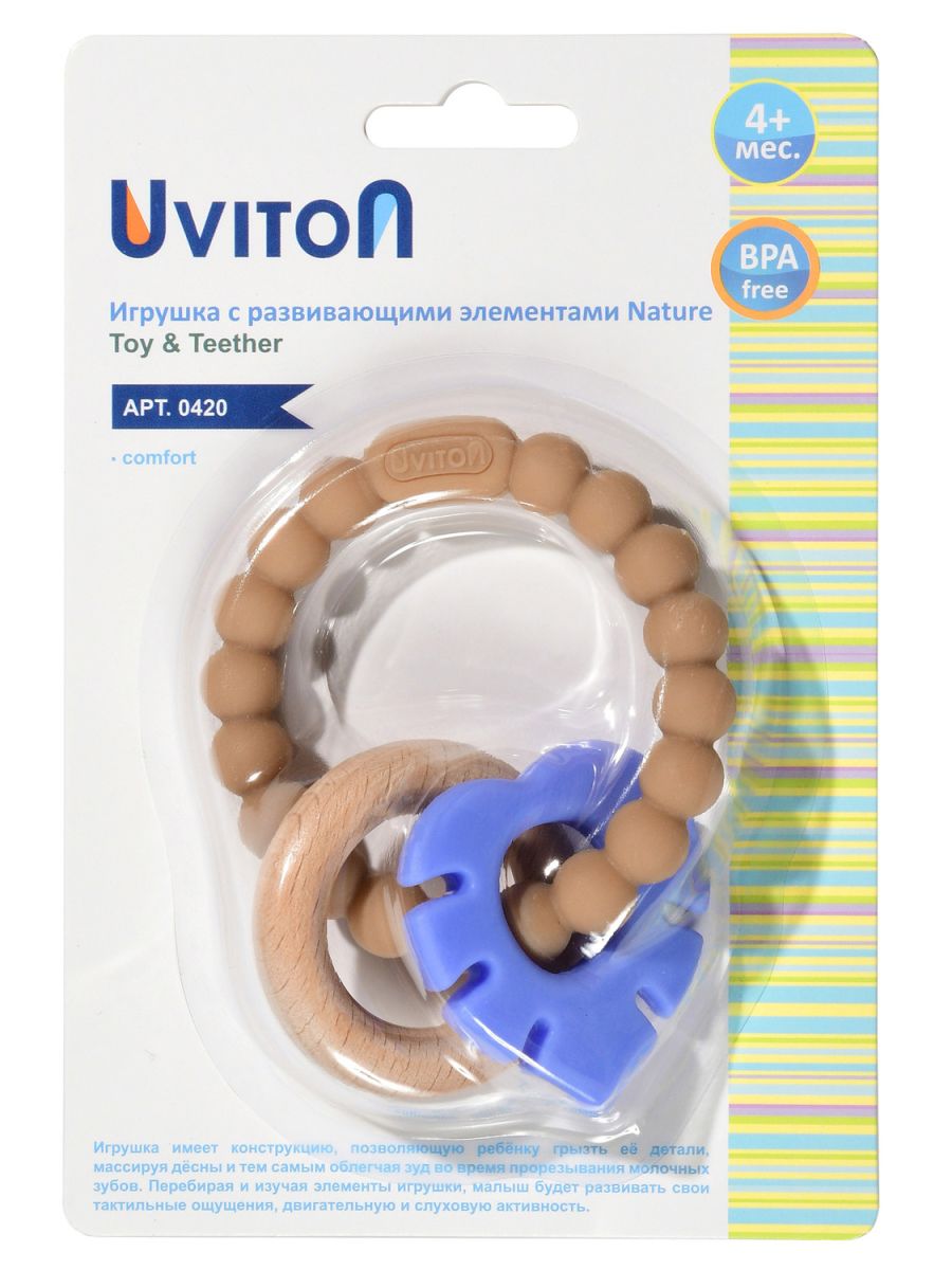 Элементы природы присутствуют в игрушке, в виде мягкого силиконового листочка и букового кольца. С ним так интересно играть. Такой прорезыватель-игрушка обеспечит спокойствие малышу и гармоничное развитие.